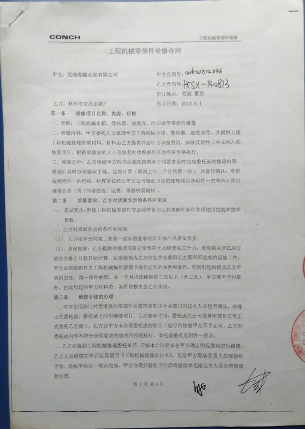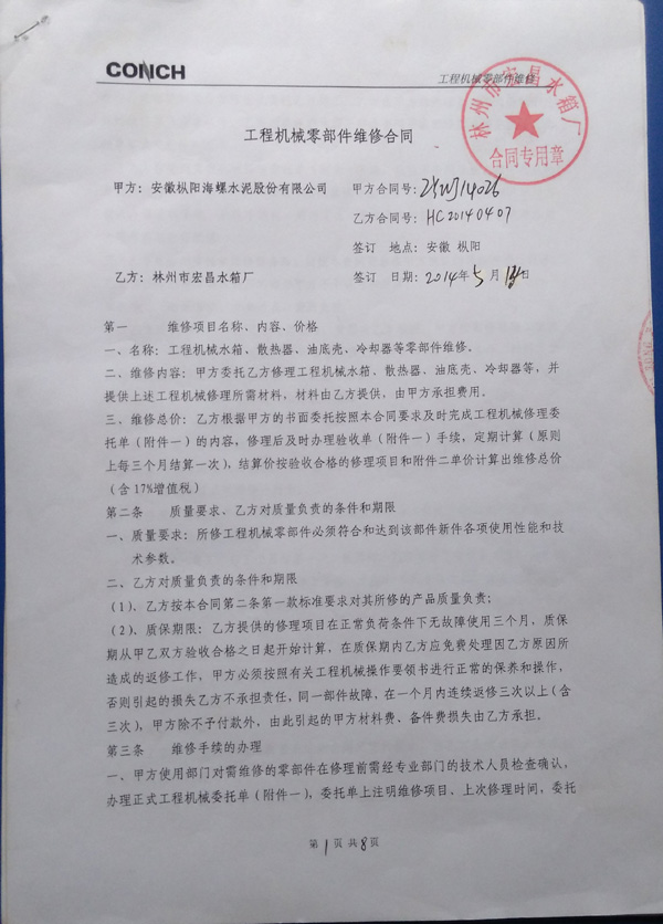 2014年5月我公司同安徽(樅陽)海螺集團(tuán)簽訂長(zhǎng)期維修合同