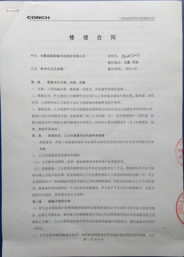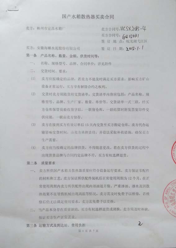 2015年元月我公司同安徽海螺水泥集團(tuán)有限公司簽定了國(guó)產(chǎn)散熱器買賣合同